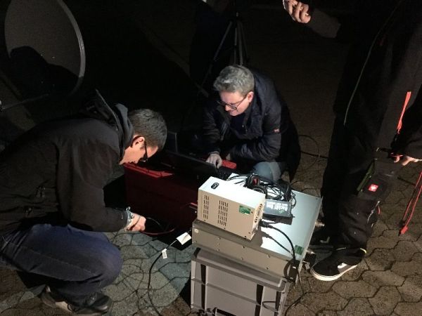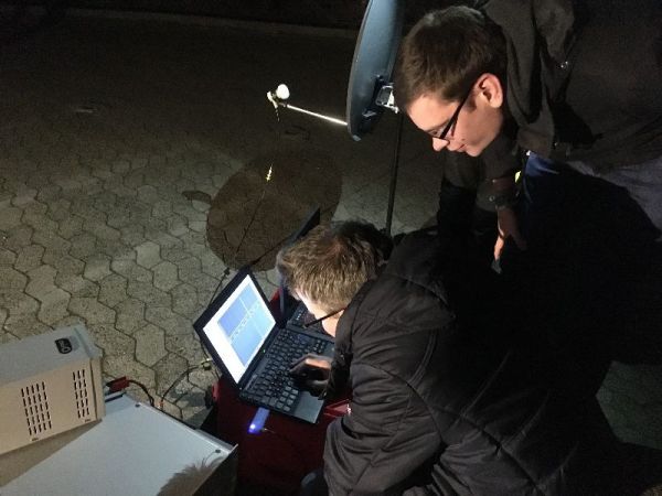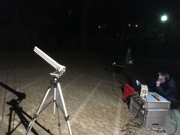Der geostationäre Satellit Es'hail-2 ist seit Mitte Februar zum Betrieb freigegeben. Wir haben daher einen temporären Aufbau zusammengestellt, um mit einfachen und kostengünstigen Mitteln QSOs zu fahren. Auf der Empfangsseite verwenden wir ein handelsüblichen Satelliten-LNB für 10€ aus einem Lebensmittelmarkt (einmal hin, alles drin). Dieser wurde nicht modifiziert, so dass die Empfangsfrequenz von 10,489 GHz auf 739 MHz umgesetzt wird. Das liegt bereits im Empfangsbereich eines billigen RTL-SDR Sticks. Ein Bias-Tee aus dem Schrott (Spule und Kondensator) versorgte den LNB mit den nötigen 14 V. Eine Satellitenschüssel vom Discounter hatten wir geerbt.