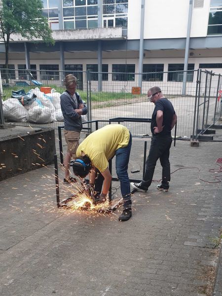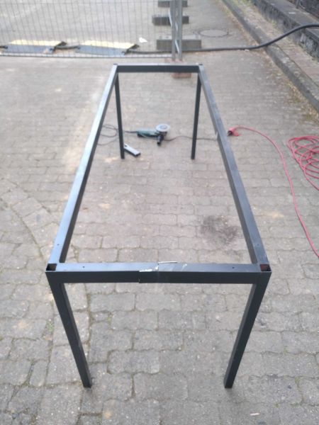 Letzte Woche haben wir ein paar alte Tische bearbeitet, damit diese über die Rohre in der Werkstatt passen. So nutzen wir dort die maximale Breite des Raums aus und haben mindestens zwei Arbeitsplätze.
