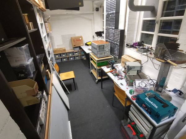 Damit die neuen Custom-Tische von letzter Woche auch vernünftig in die Ecke gehen, musste der alte Schrank in der Werkstatt weichen und wird demnächst durch ein Regalsystem ersetzt. Es sieht so deutlich wohnlicher aus und der Roll-Tisch, auf dem zukünftig die Messgeräte Patz finden sollen, passt zwischen die Tische.